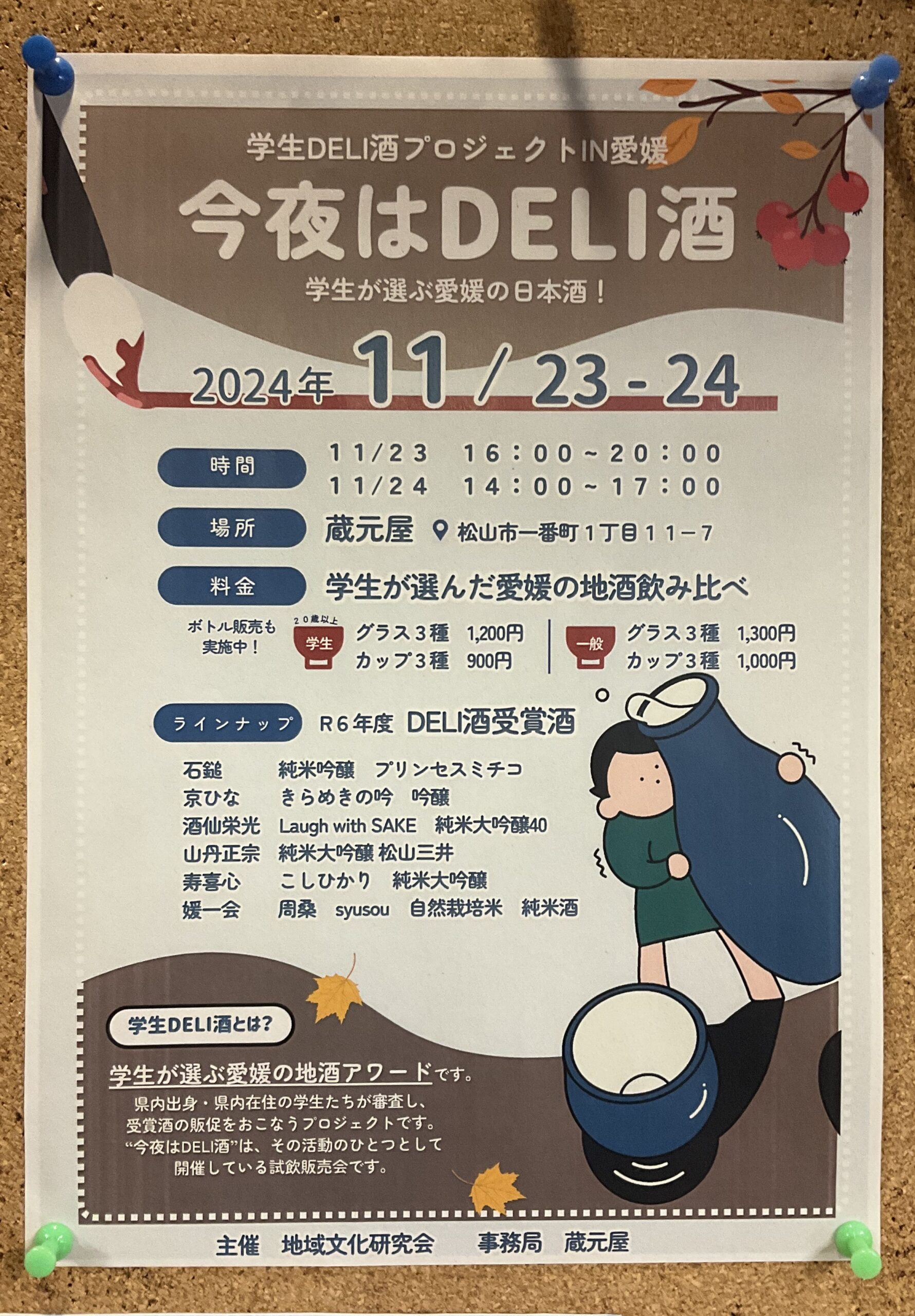 愛媛大学の地域文化研究会の学生さんたちによる「学生DELI酒」の試飲会が11月23・24日で行われるそうです。
